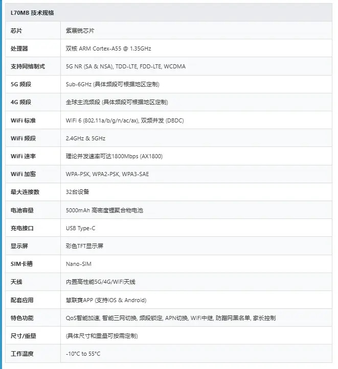 L70MB的心脏是来自紫光展锐芯片。这是一款专为高速移动宽带设备设计的专业级芯片,而非简单的手机处理器方案,这确保了其在网络处理上的专业性与高效性。基于双核ARM Cortex-A55处理器,主频高达1.35GHz,为复杂网络协议处理和高强度数据转发提供了强大的算力支持。